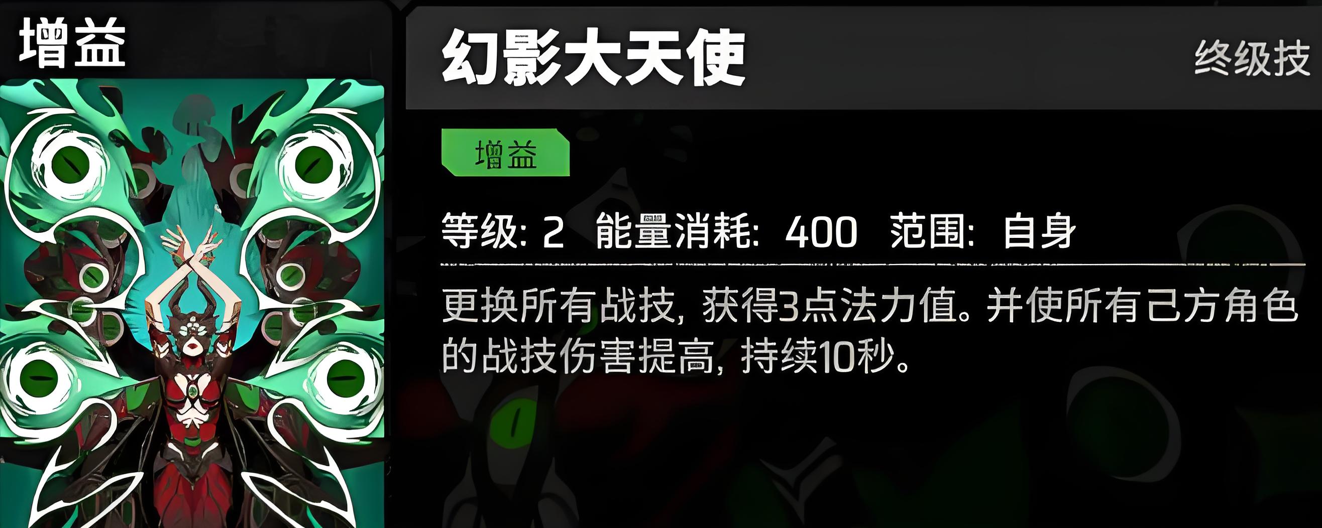 3、大招幻影大天使换所有战技,持续一段时间提队友,战技伤害集火前用,增强团队爆发输出效果。