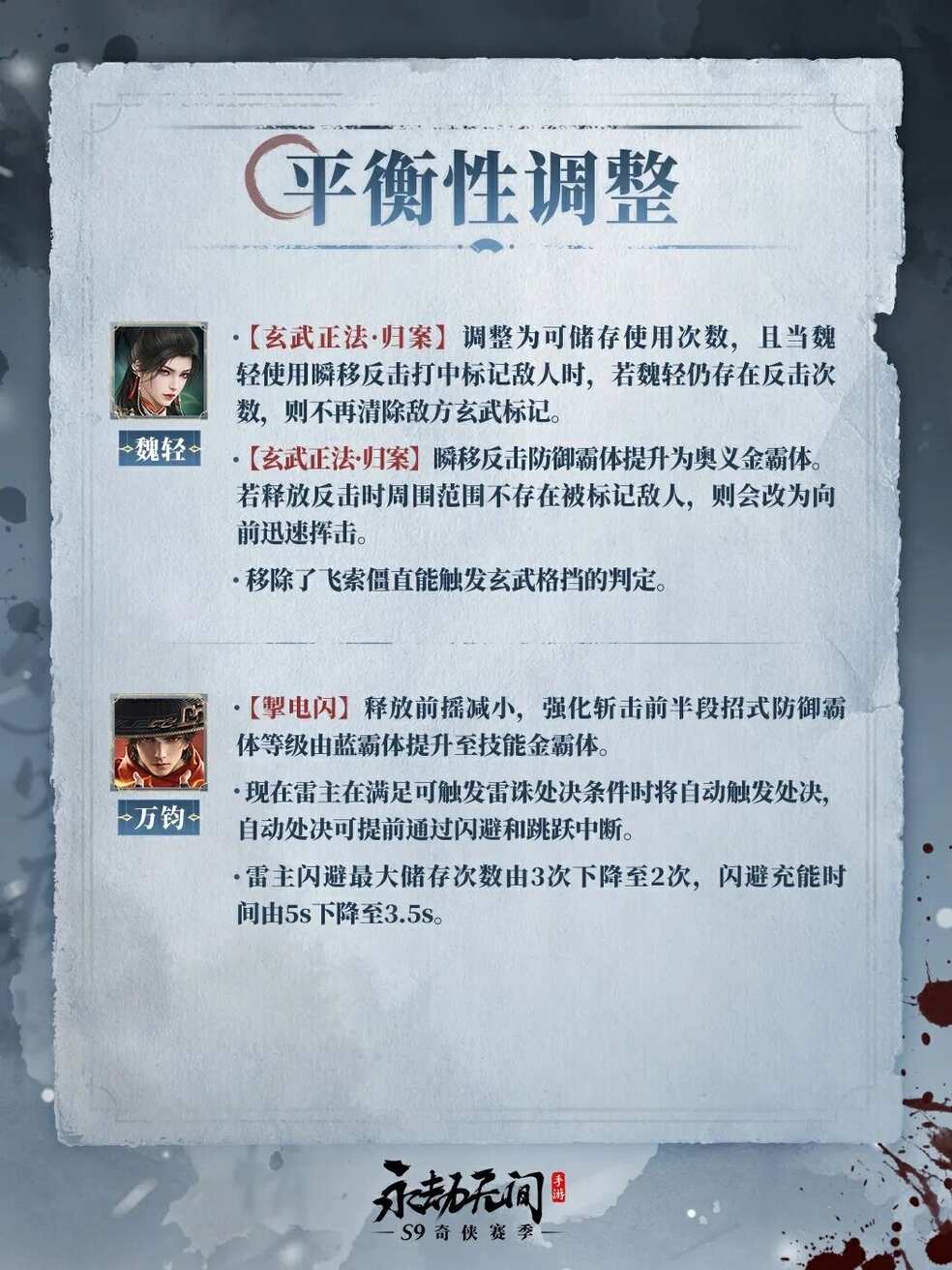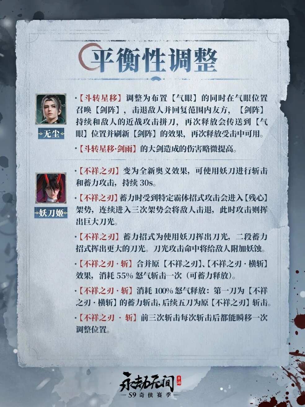 S9赛季英雄也迎来调整,根据后台数据与玩家反馈。我们将针对无尘、妖刀姬、魏轻、万钧、席拉、殷紫萍、崔三娘做出如下调整。