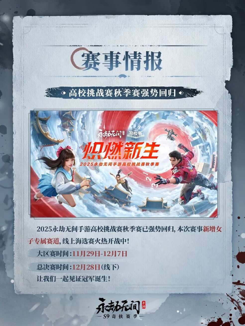 3、9月20日起,永劫无间手游校园行再度起航,成都、重庆、广州、长沙、大连等城市巡回酣战,还有更多城市等待解锁,劫妹期待与各位英雄面基。