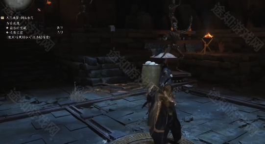 7、再来到右边,对着右边使用听声辨位,看到门旁边的雕像,然后再将这个雕像调成如图所示的动作,然后就可以去拿所有的宝箱了