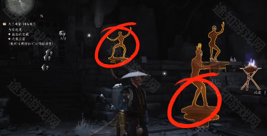 5、然后我们来到下一关,站在如图所示位置,我们会围在一群雕像中间,我们只需要将门两边的雕像弄成一模一样的动作就可以,这次我们打开的是中间的门