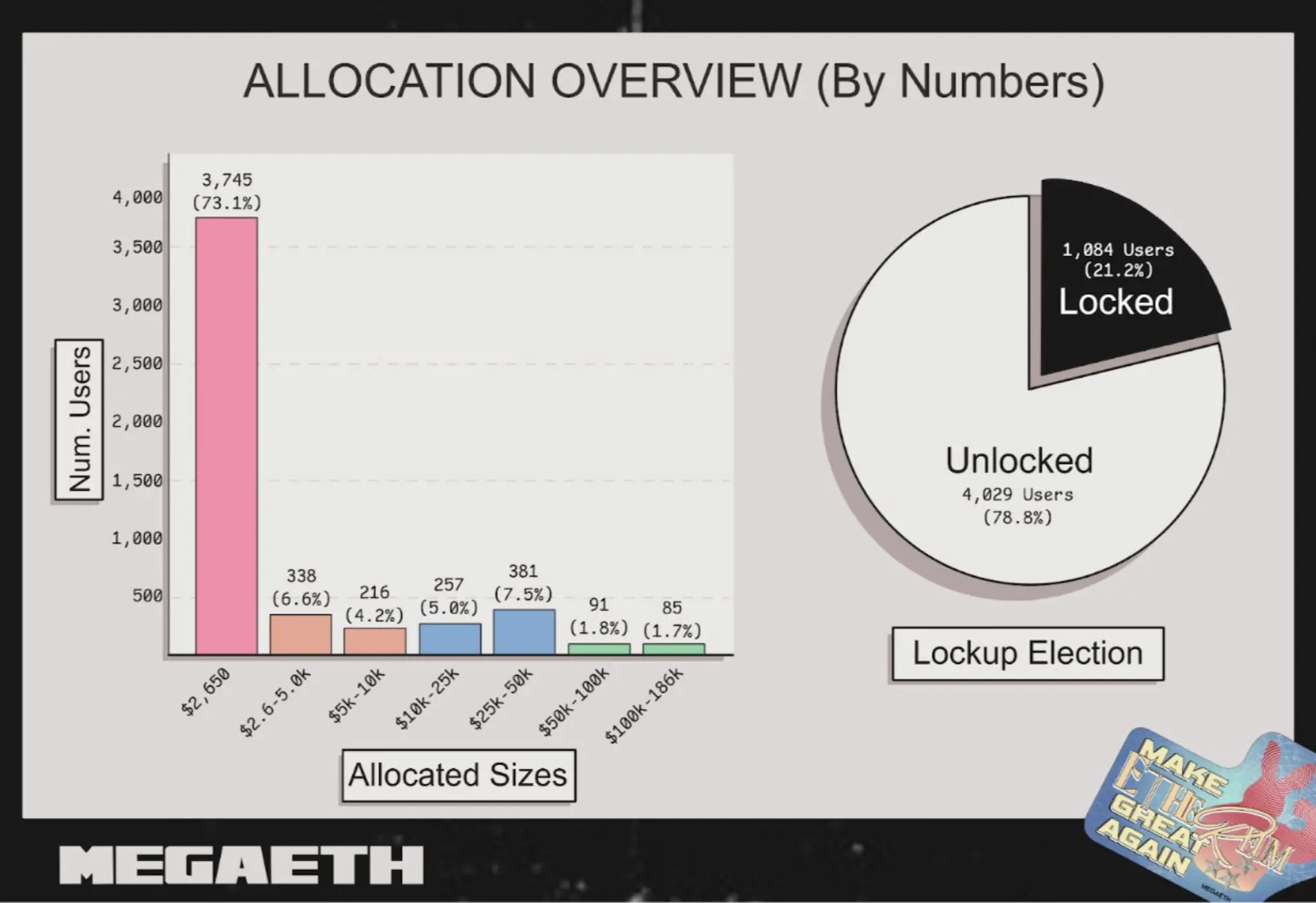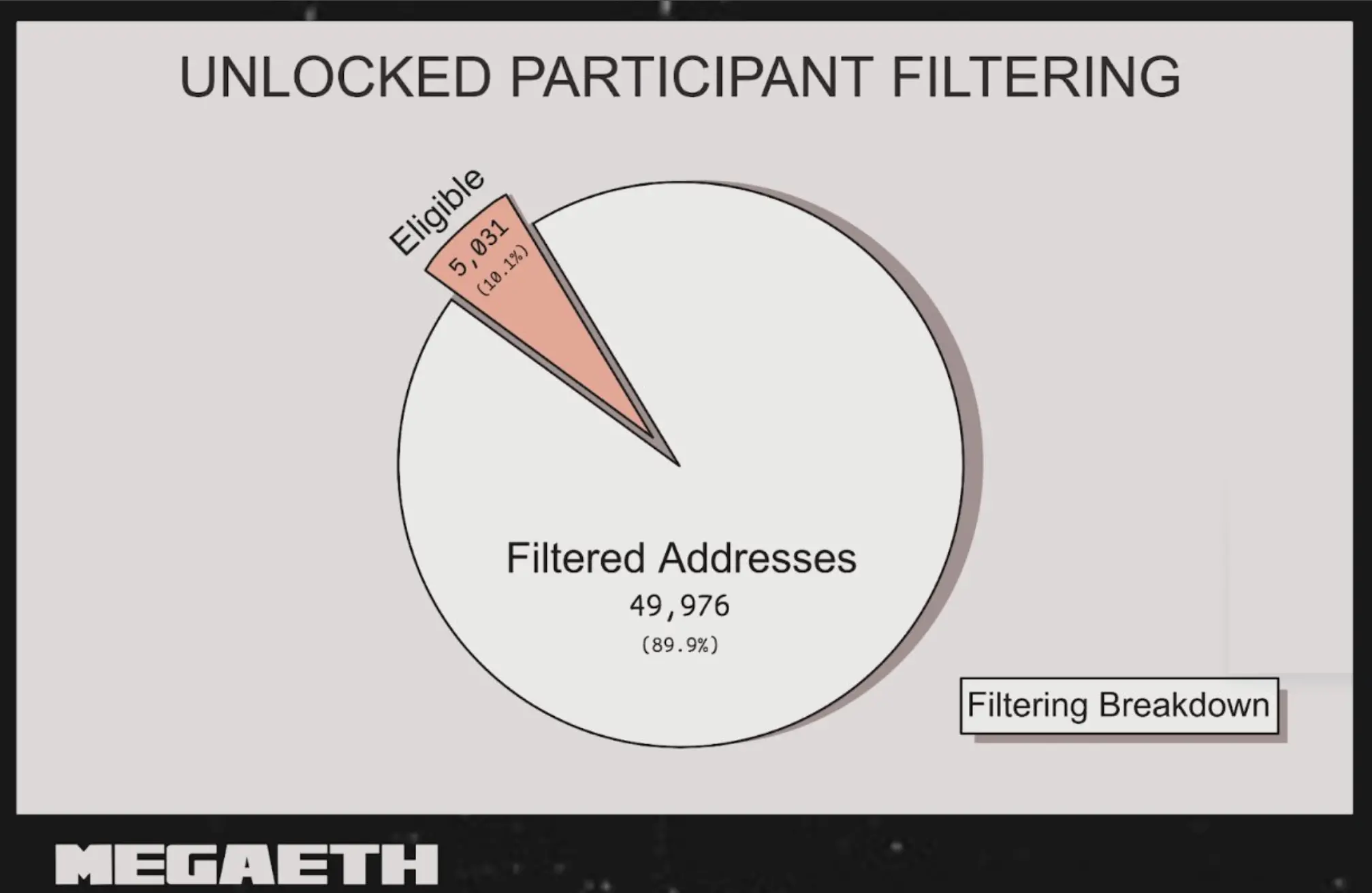 实际上,在 49,976 名未锁定参与者中,有 5,031 个签报通过了此筛选,接受率约为 10.1%。通过筛选的地址之间的竞争非常激烈,即使是为了最低份额。我们相信算法会完成它的工作,并充分意识到有些人—即使有大量的 MegaETH 活动和持仓—如果他们的其他指标很弱,也无法入围。但这是一场公平的游戏,我们尊重结果。