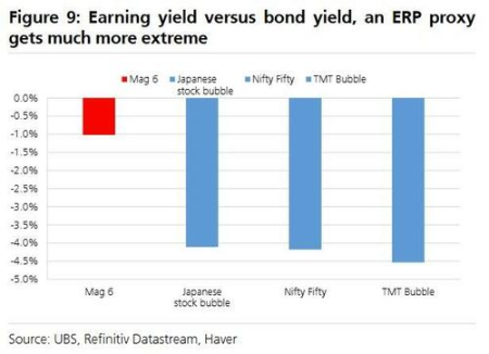 1、明确的估值过高:历史上的泡沫顶峰通常伴随极端估值。例如,在之前泡沫中,至少 30% 市值的公司市盈率会升至 45 倍至 73 倍,而目前「科技七巨头」(Mag 6) 的动态市盈率为 35 倍。同时,股权风险溢价 (ERP) 也未降至 2000 年或 1929 年时约 1% 的极端低位。