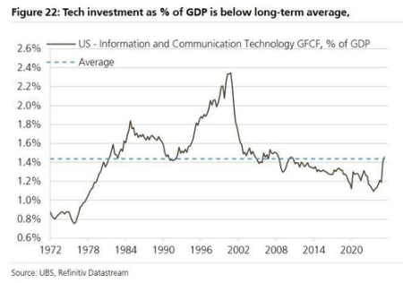2、长週期见顶催化剂:报告指出,多个长期指标也未显示见顶迹象。首先,资讯和通信技术 (ICT) 投资占 GDP 的比重远低于 2000 年水平,未出现明显的过度投资。