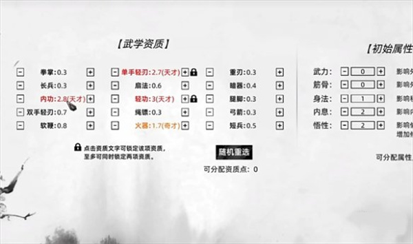 初始属性:推荐身法1点、内息2点、悟性2点。