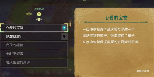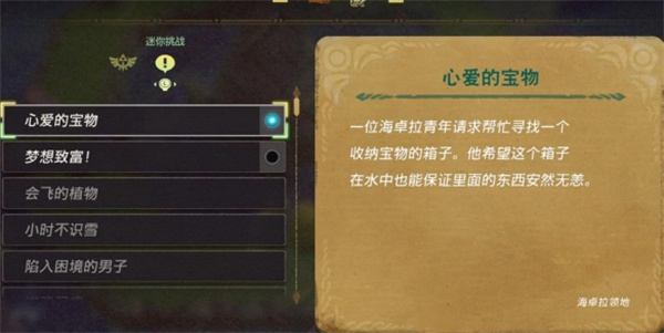 1、前往【海卓拉领地】对话图示位置处的NPC触发迷你挑战【心爱的宝物】;