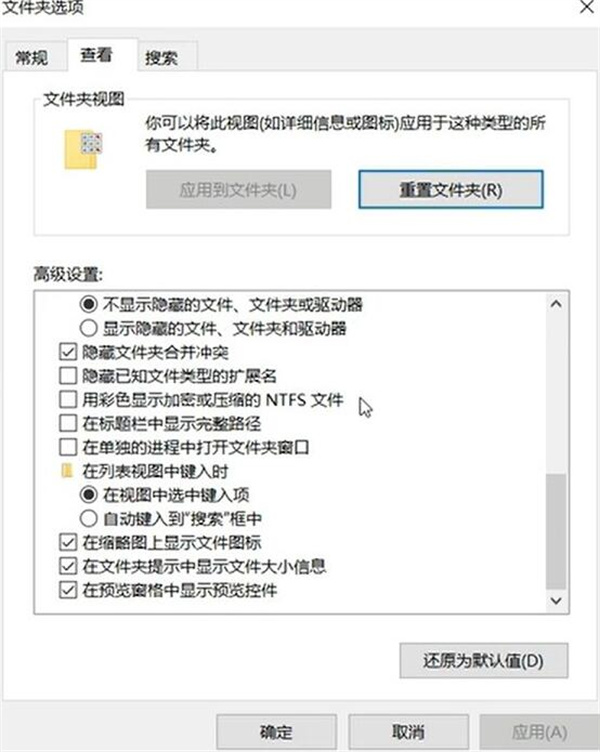 1、在【查看】文件夹选项里,选择【显示隐藏的文件】,然后点击应用和确定。