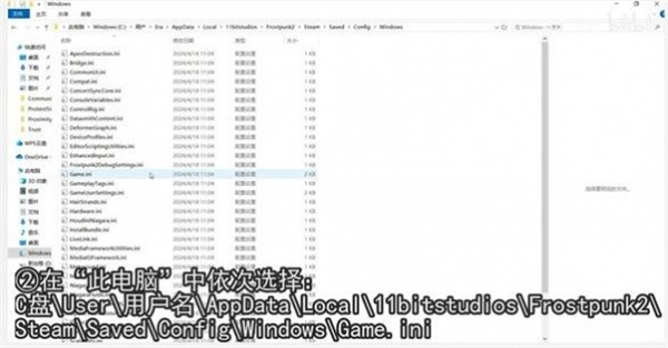 C盘User用户名AppDataLocal11bitstudiosFrostpunk2SteamSavedConfigWindowsGame.ini