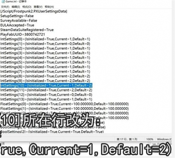 3、找到Game.ini文件,然后打开,将IntSettings[10]所在行改为:IntSettings[10]=(IsInitialized=True,Current=1,Default=2)