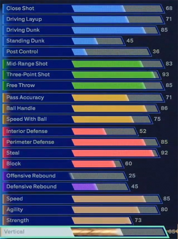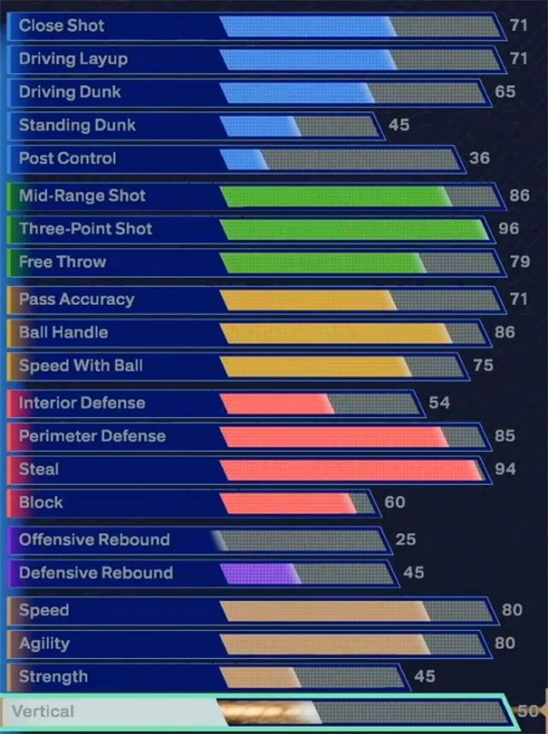 第二种建法降低了切入扣篮和力量,换来了96的三分和94的抢断,紫色射程无限、紫色强投、紫色定点投篮、紫色拦截者,速度降低到了80,进攻更加极致。