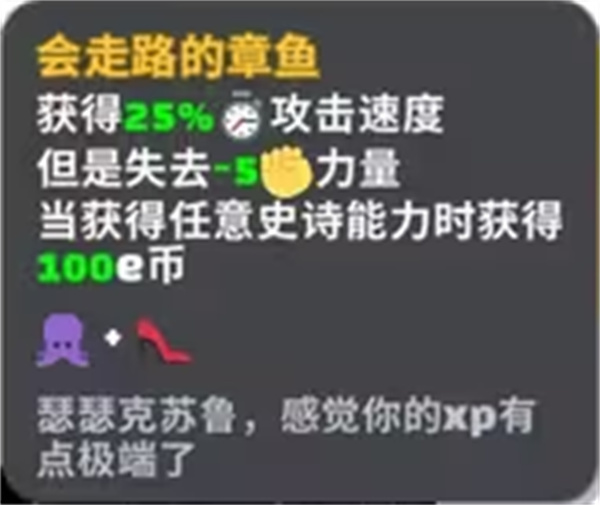 会走路的章鱼:获得25%攻击速度,但会失去5点力量,当获得任意史诗能力时获得100e币。
