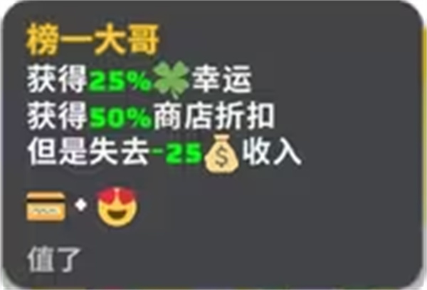 榜一大哥:获得25%幸运,商店打5折,但会失去25收入。