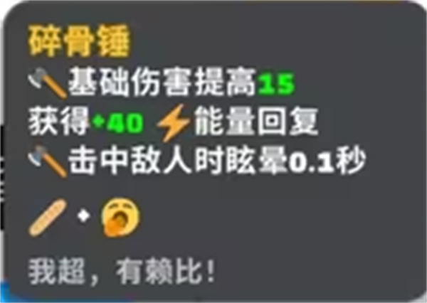 碎骨锤:斧子基础伤害+15,获得+40能量恢复,斧子击中敌人时眩晕0.1秒。