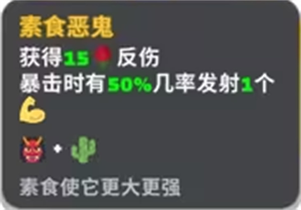 素食恶鬼:获得15反伤,暴击时有50%几率发射一个肌肉。
