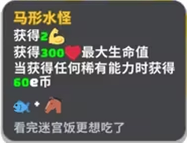 马形水怪:获得2肌肉,300最大生命值,当获得任何稀有能力时获得60e币。