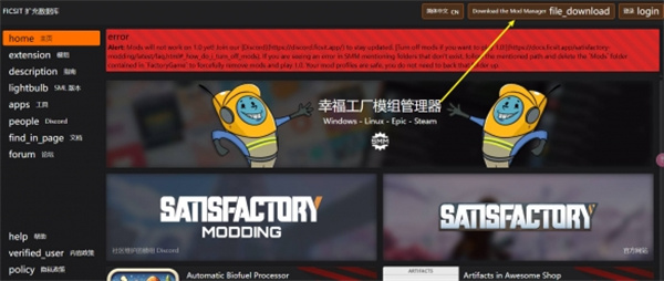 1、通过“https://ficsit.app/”下载MOD管理器,并按照提示配置控制台。
