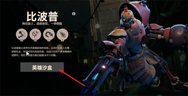 2、随便点击一个英雄进入它的介绍页面,再点击页面中的「英雄沙盒」。