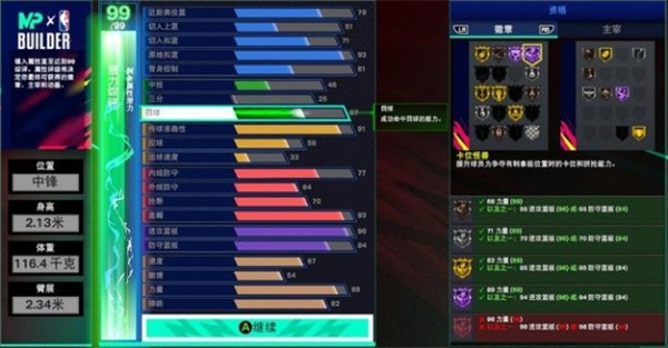 这套中锋建模的身材设定是主要用来打防守的,防守和基础属性基本都到上限了。