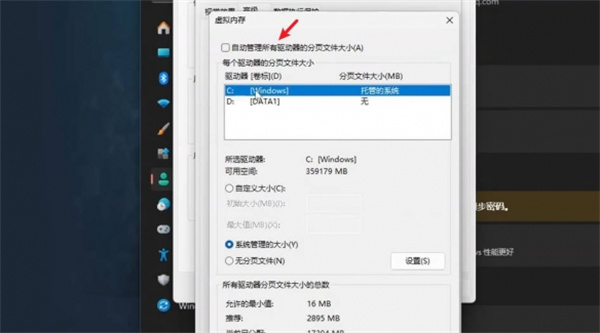 3、「高级」栏中点击虚拟内存框内的“更改”选项,去掉「自动管理」的勾,选择自己游戏的安装盘。