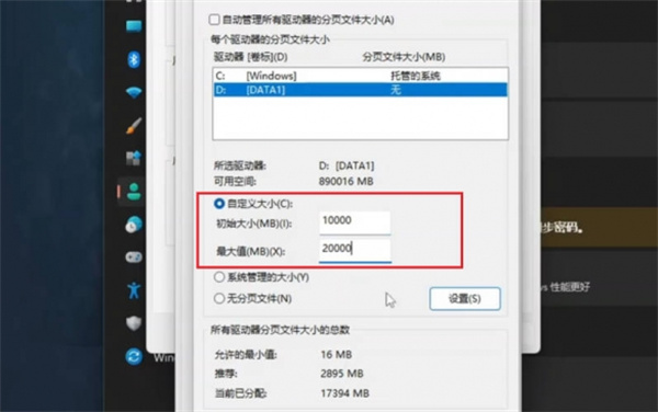 4、按下图设置自定义虚拟内存大小,而后重启电脑,有概率解决问题。