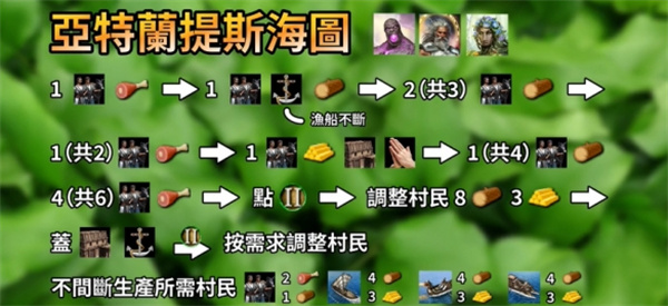 5、亚特兰提斯的海图,开场一村采肉,一村去盖渔港,盖完之后就原地伐木,渔船要不停地出。