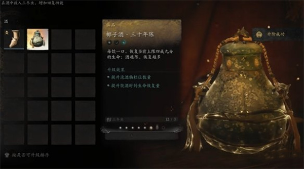 在动作角色扮演游戏黑神话悟空中,玩家可以提升酒酿的品质,品质越高效果越好,部分玩家不知道选哪个比较好,下面就为大家带来黑神话悟空中仙品酒酿的选择推荐,有需要的玩家可以参考。