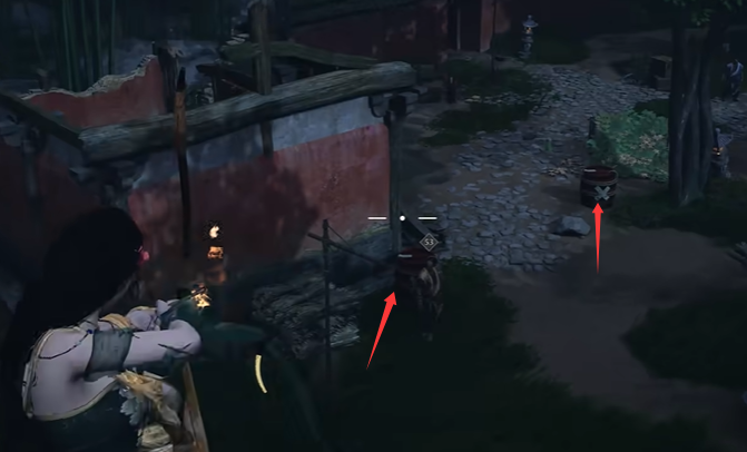 2、爬到附近的房顶上,用弓箭引爆炸药桶炸死附近的怪。