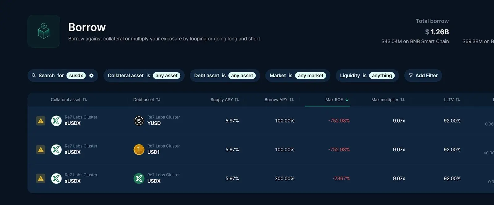 而平台 Morpho 和 Euler 的隐藏市场利用率飙升至 95% 至 100%,利率一度出现负 752% 的异常数值,显示抵押品已成死账。Compound 则紧急关闭部分市场,Silo、Treeve 的 scUSD 等协议也跟随脱钩。