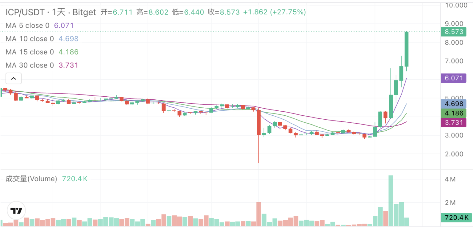 11 月 1 日开始,许久没有声音的 Internet Computer(IC)代币 ICP 启动了一轮上涨。据 Bitget 资料,ICP 价格从 2.94 美元附近一路涨至最高 8.6 美元附近,7 天上涨了近两倍。