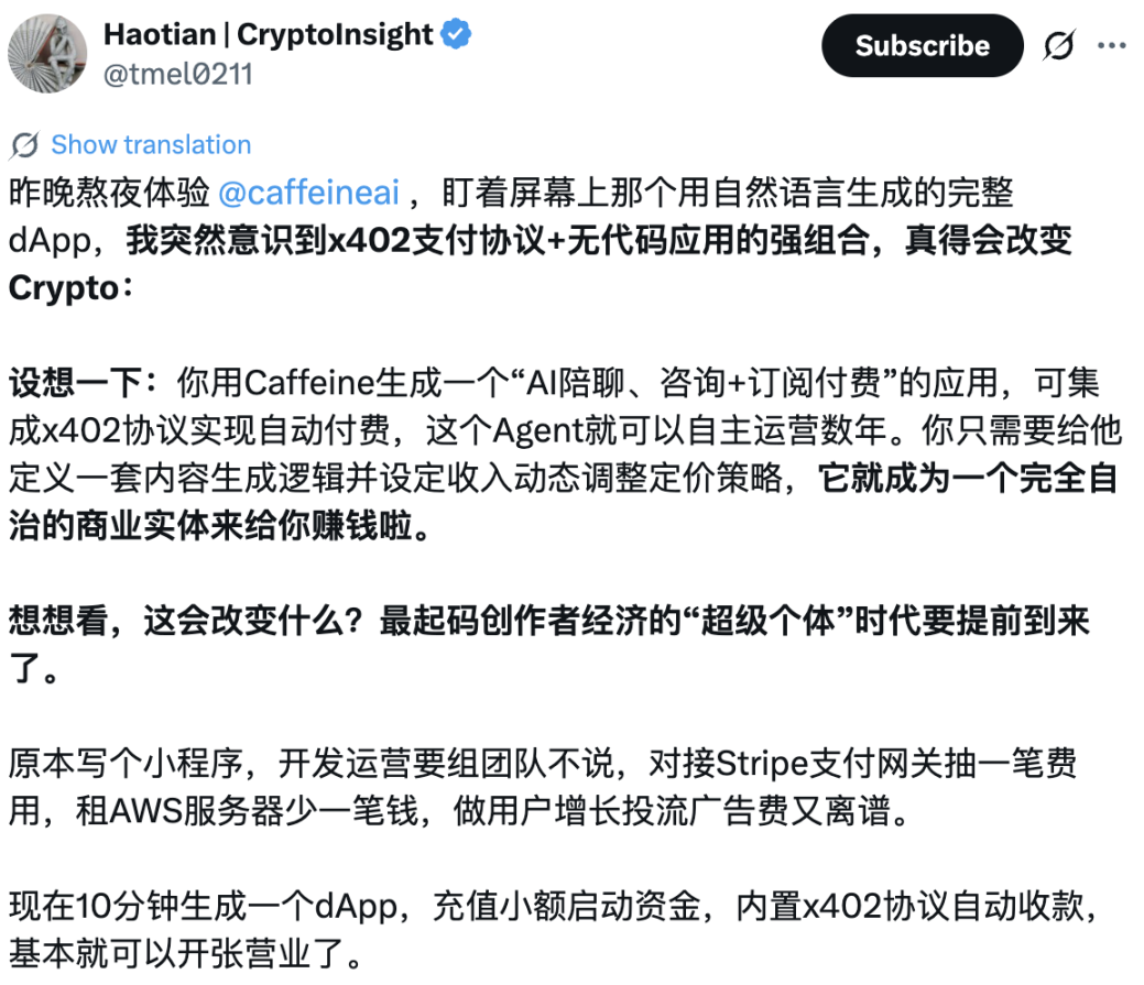 X 使用者 Haotian 于昨日下午对 caffeine 可能为 AI 支付带来更多改变的观点,也进一步让中文市场的情绪发酵。