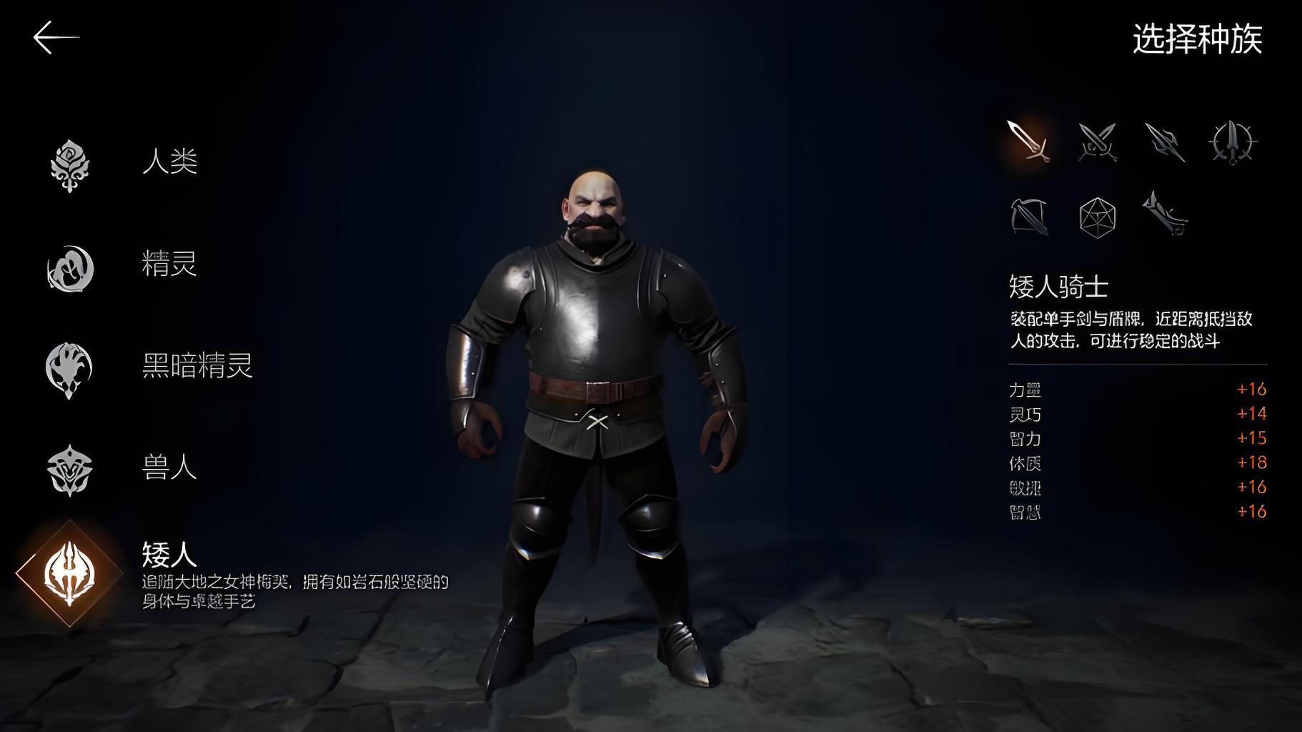 1、种族职业选择需先在五大种族中选矮人,再选择进阶为矮人骑士,该职业可装备单手剑和盾牌,擅长近距离抵挡敌人攻击。