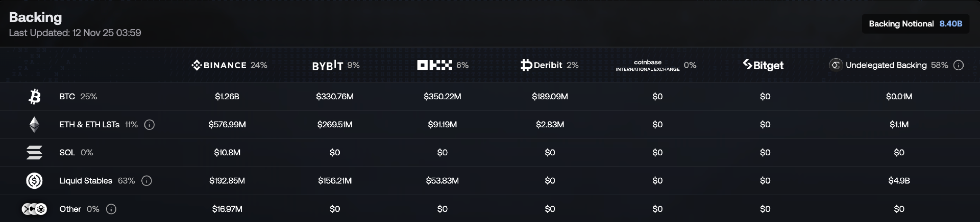 第二点则是前文提到的 ADL 致使中性策略失衡的问题。传闻 Ethena 与部分交易所签有 ADL 豁免协议,但此事始终未能证实,所以暂且不提。 可即便没有豁免条款,Ethena 实质上也较难受到 ADL 影响。 因为从其公开策略中能看出 Ethena 基本只选择了 BTC、ETH、SOL 作为对冲资产(BNB、HYPE、XRP 占比极小),这三大资产在 10 月 11 日大暴跌中的波动本就较小,对手方的承载能力也更大,而 ADL 实际上更容易出现在波动更大、对手方承载能力较小的山寨币市场,因此当下暴雷的往往是那些不够透明的协议(可能策略相较规划过于激进,甚至完全不中性)。