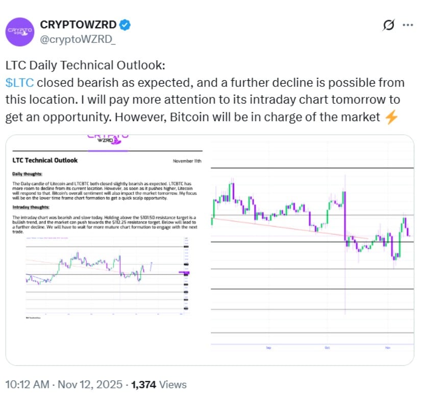 莱特币(LTC)收盘呈现看跌形态,可能进一步下行,但市场方向仍主要受比特币走势影响。来源:@cryptoWZRD_ via X
