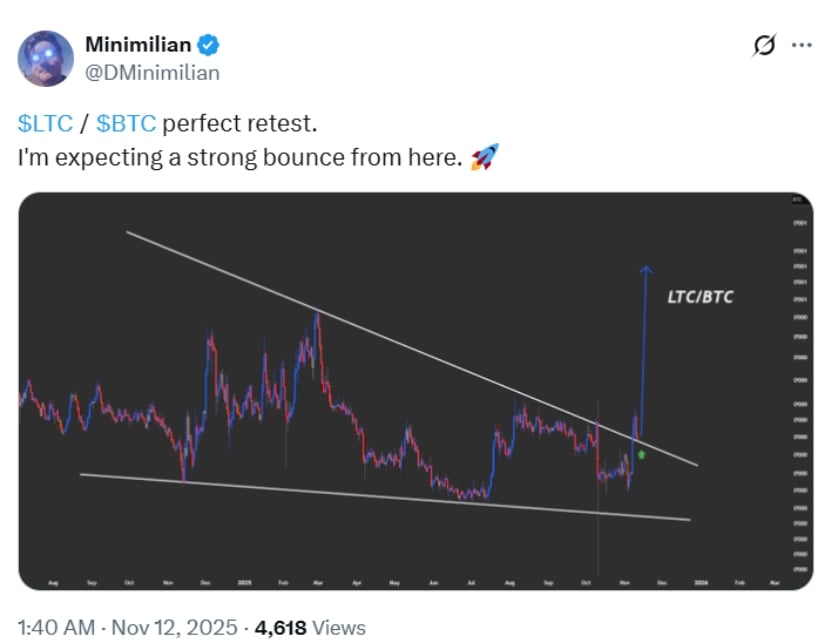 莱特币(LTC)已完成完美的LTC/BTC回测,预示可能出现强劲反弹。来源:@DMinimilian via X
