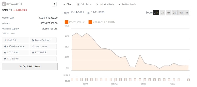 莱特币最新交易价约99.52美元,24小时下跌4.96%。来源:Brave New Coin