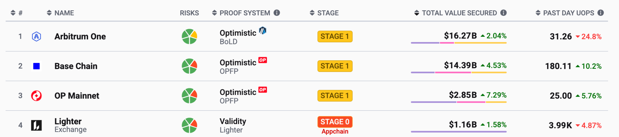 事实上,Lighter 并非一开始就瞄准了 perp DEX 的方向。2022 年底上线的 Lighter 是 Arbitrum 上的现货 DEX,在 2023 年才开始转型 perp DEX,并着手开发自己的 ZK Rollup,主网更是今年 10 月才正式上线。不过上线仅一个多月的 Lighter 已经成为了 TVL 仅次于 Arbitrum One、Base 和 OP Mainnet 的第四大 L2。连 OG 蓝狐都感叹没想到定制化 L2 会比通用型 L2 更先跑出来。