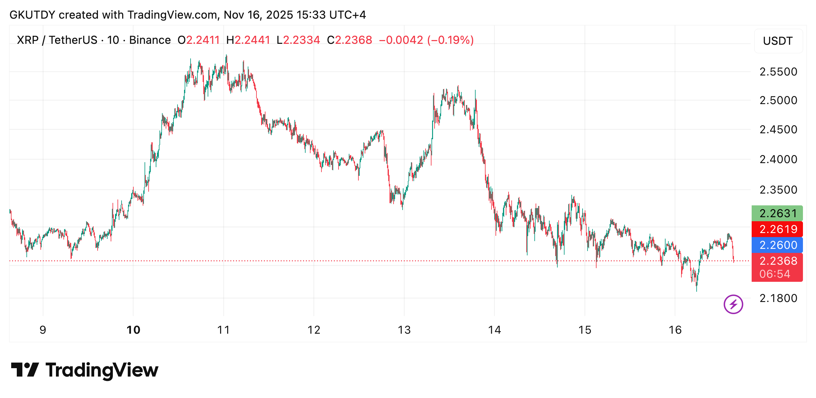 近期XRP价格上蹿下跳,先是冲至2.34-2.36美元区间,又迅速回落至2.20-2.22美元。这种无序波动使得该标的成为无法松懈的战场。