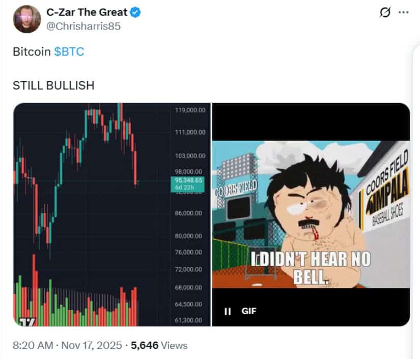 該貼文以幽默方式將比特幣急跌解讀為暫時現象,呼應歷史反彈模式。來源:C Zar The Great/X平台