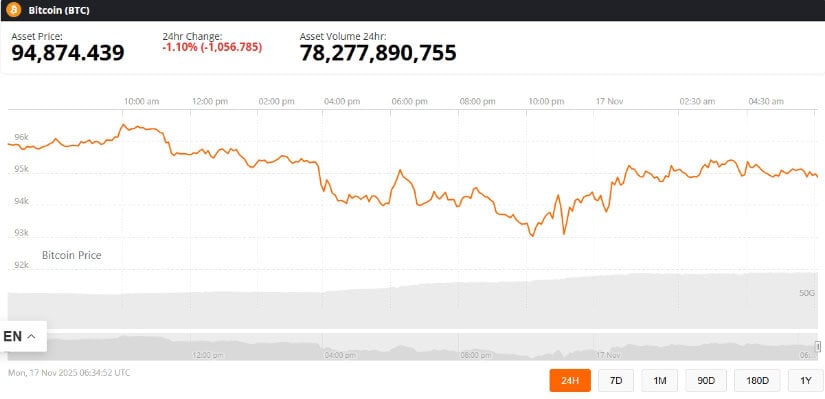 2025年11月16日,比特幣短暫下探至93,684美元後反彈至95,087美元附近(TradingView數據)。這是自5月以來的最低水平,恰逢市場避險情緒高漲。