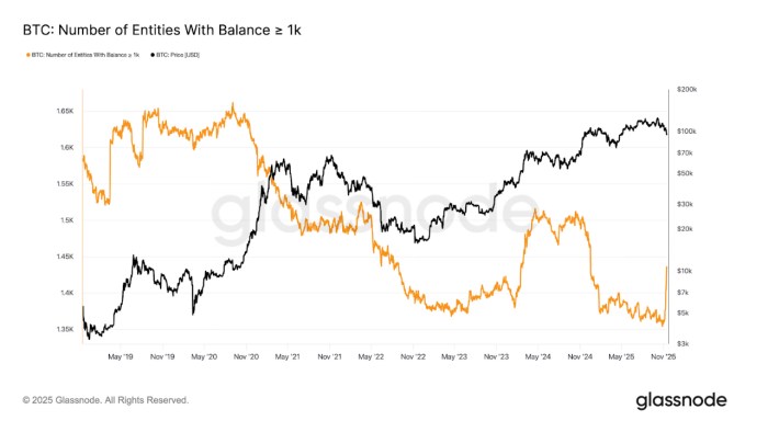 最新链上数据揭示惊人趋势:在市场急剧回调期间,持有至少1000枚比特币的实体数量已攀升至1,436个。