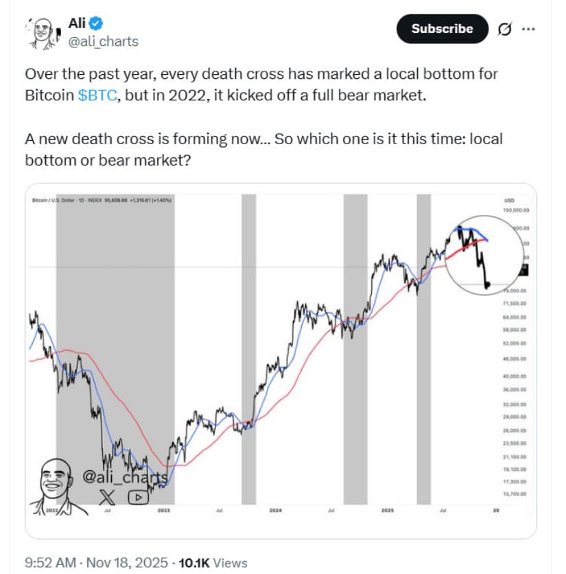 专注波动行情中技术形态的加密货币分析师Ali指出:"过去一年每次死亡交叉都标志着比特币的局部底部,但2022年它曾引发长期熊市。当前形态可能预示局部底部或跌势延续。"死亡交叉(50日均线下穿200日均线)被广泛用于识别动量转换。实践中交易员多将其视为预警信号而非价格方向保证,并逐步调整仓位。