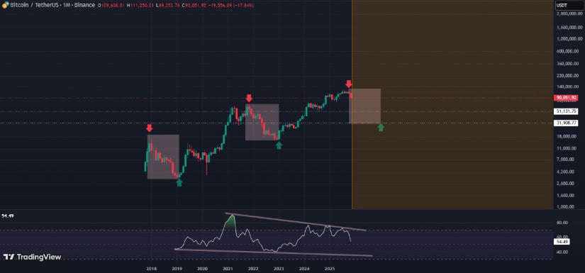 比特币处于下跌趋势,关键吸筹区位于5万和3万美元;最佳入场时机为2027年后完成完整回调并通过月线阳烛确认底部。来源:TradingView用户illuminati K027