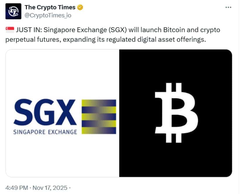 新加坡交易所(SGX)将推出比特币及加密货币永续期货,扩展其受监管数字资产产品线。来源:The Crypto Times via X