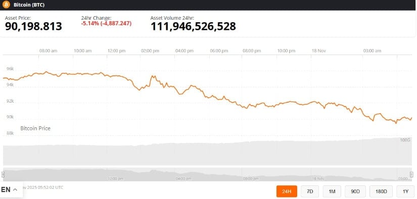 截至发稿时,比特币报价约90,198.81美元,24小时下跌5.14%。来源:Brave New Coin比特币价格指数