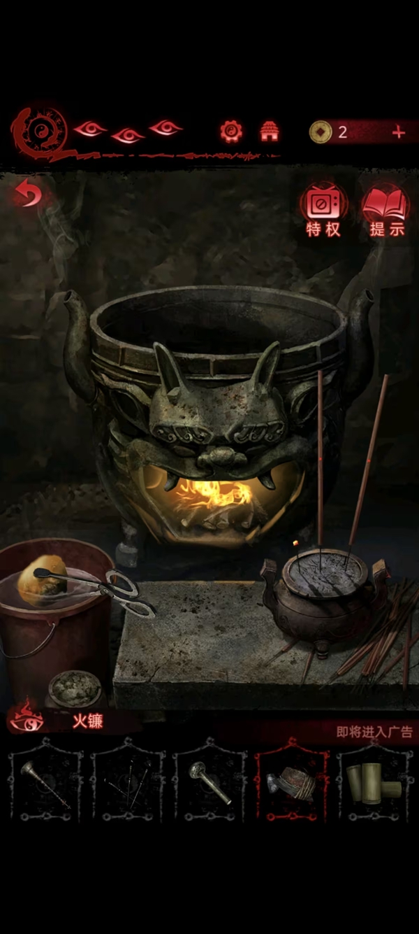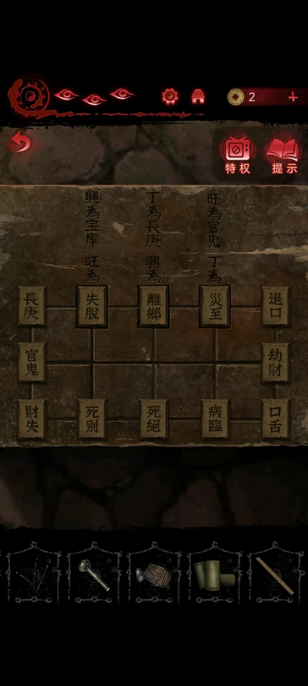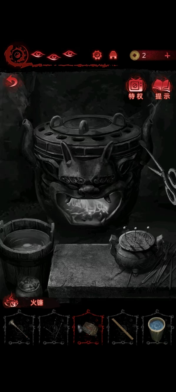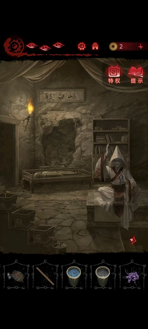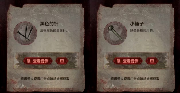 1、开局先翻开书柜的书找线索,然后玩旁边的五行相克小游戏(答案:脾水 肝土 心金 肾火 肺木),获得黑针和锤子。