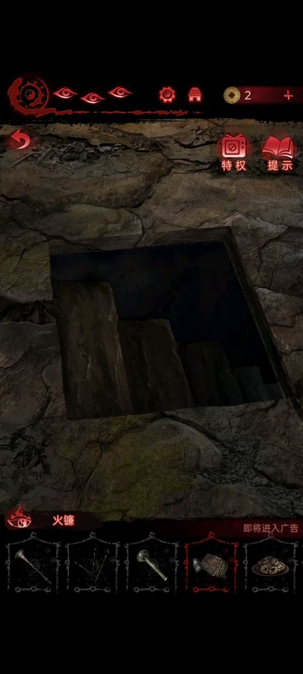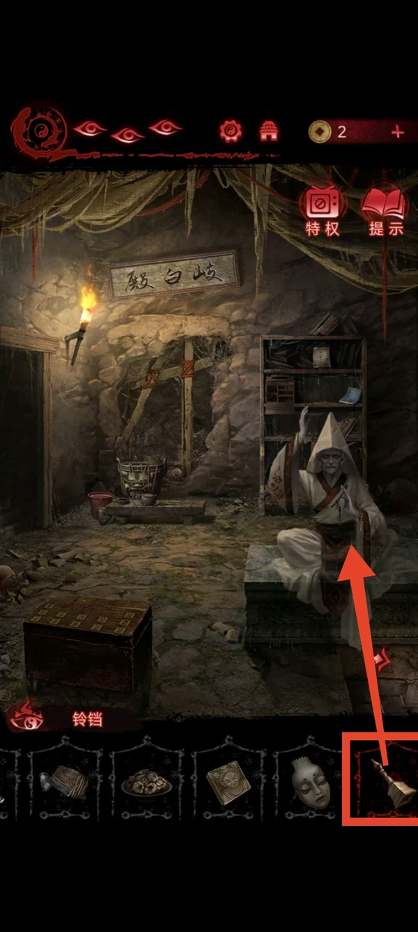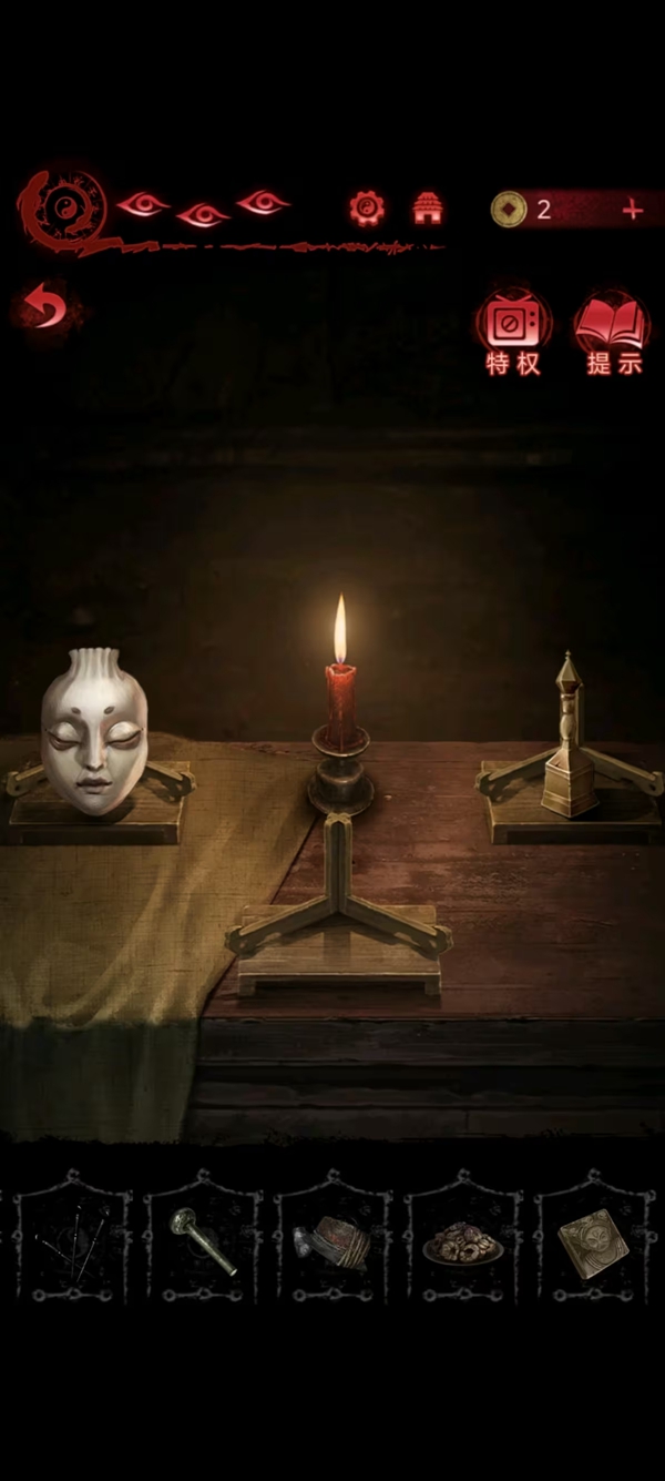 3、进入地道,点燃蜡烛,拾取地上道具“铃”和“面具”,把铃给葬老六玩几秒,获得无面铜人,下地道镶嵌到右边墙上,然后把面具和铃放桌子的架上清出背包空间。