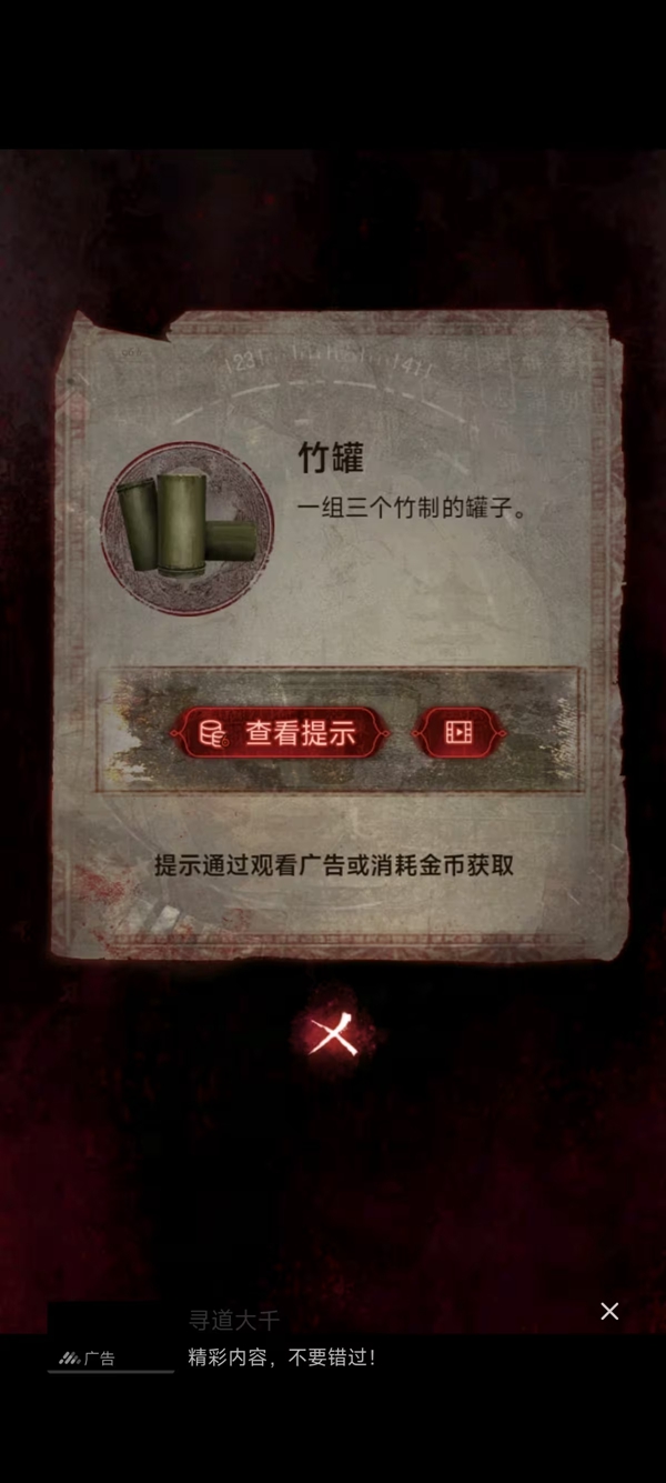 7、时光机去唐朝,去葬老六在的场景,喂“病人”吃下“仙丹”然后拔它火罐。回现代拿尺子丈量长度获得线索,(现代)葬老六场景左下角箱子迷题可解(如图),获得钗子、木鱼、亻。