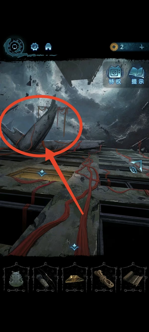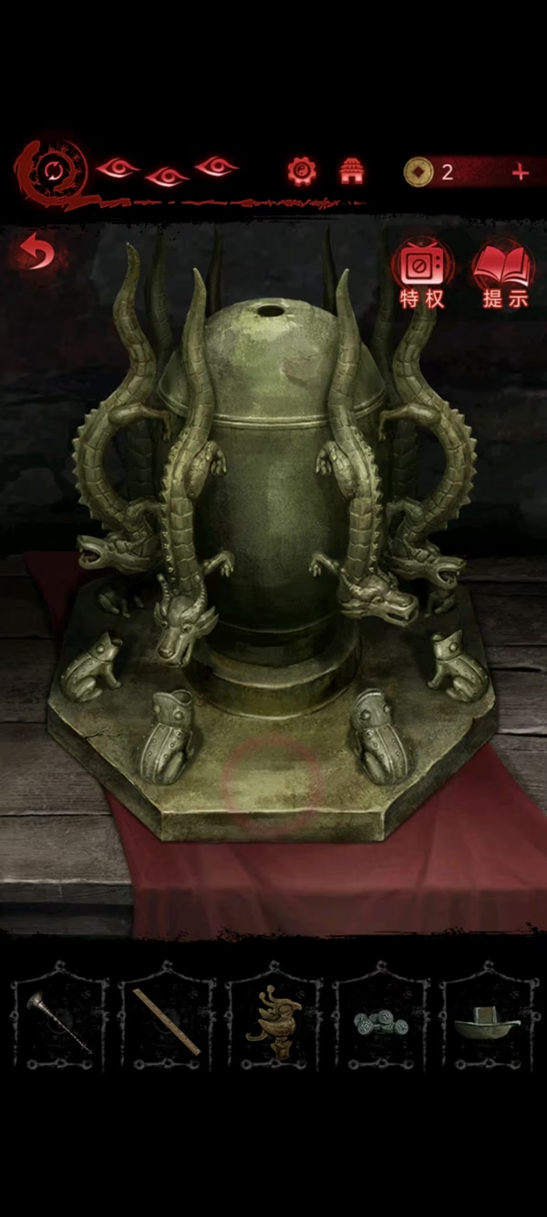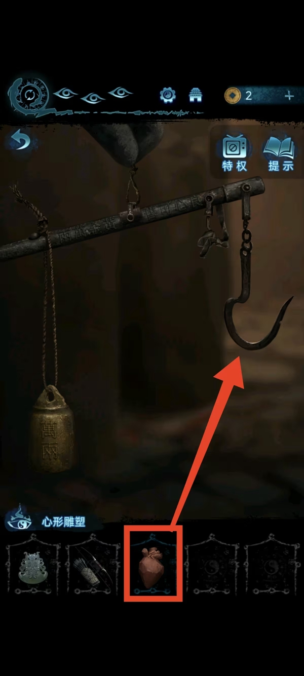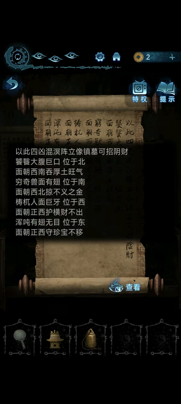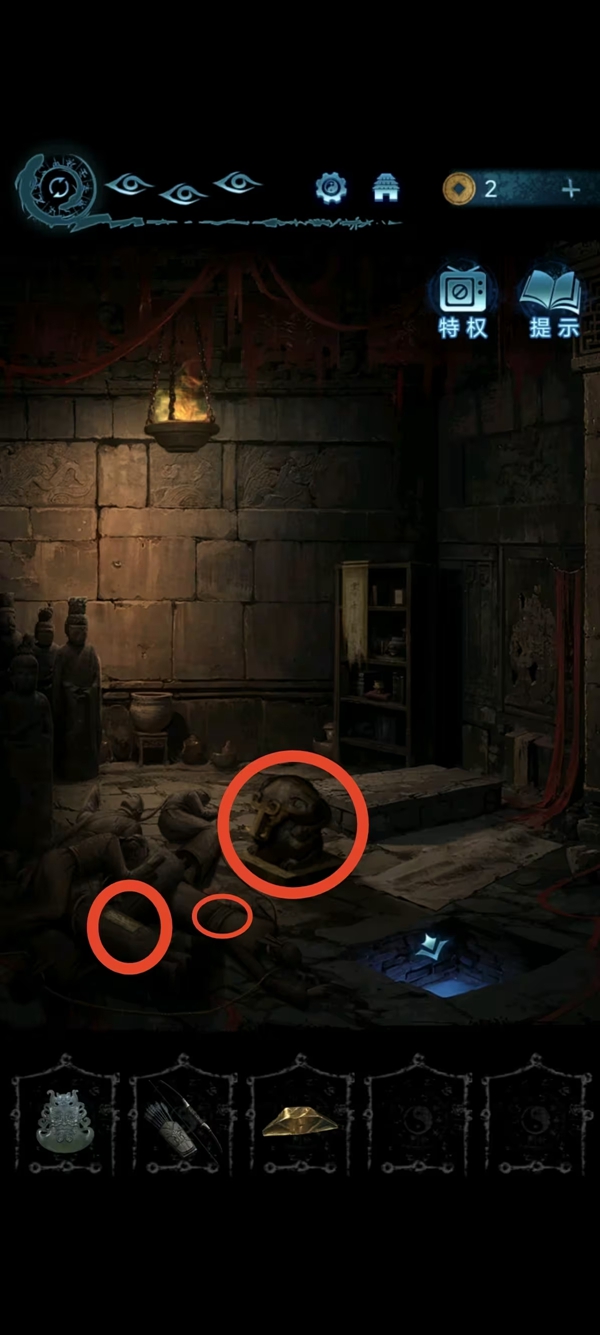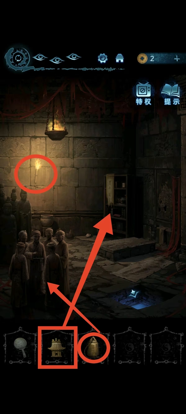8、女主捡符,给葬老六旁边的光头贴上,获得铜船和铜球,把球扔进去地动仪,按线索解谜后解锁迷宫后面的路。