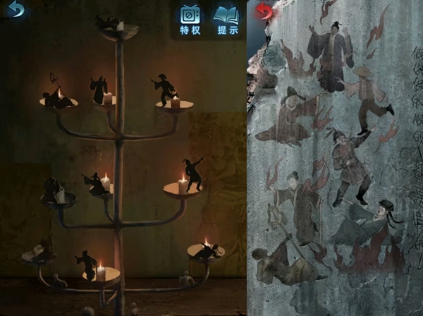 4、左边蜡烛小人,根据开局的提示点燃蜡烛如图,获得布娃娃,丢给女主。女主去把布娃娃埋进图里,桥搭成,进入迷宫,男主视角在楼上可以对照方向前进。