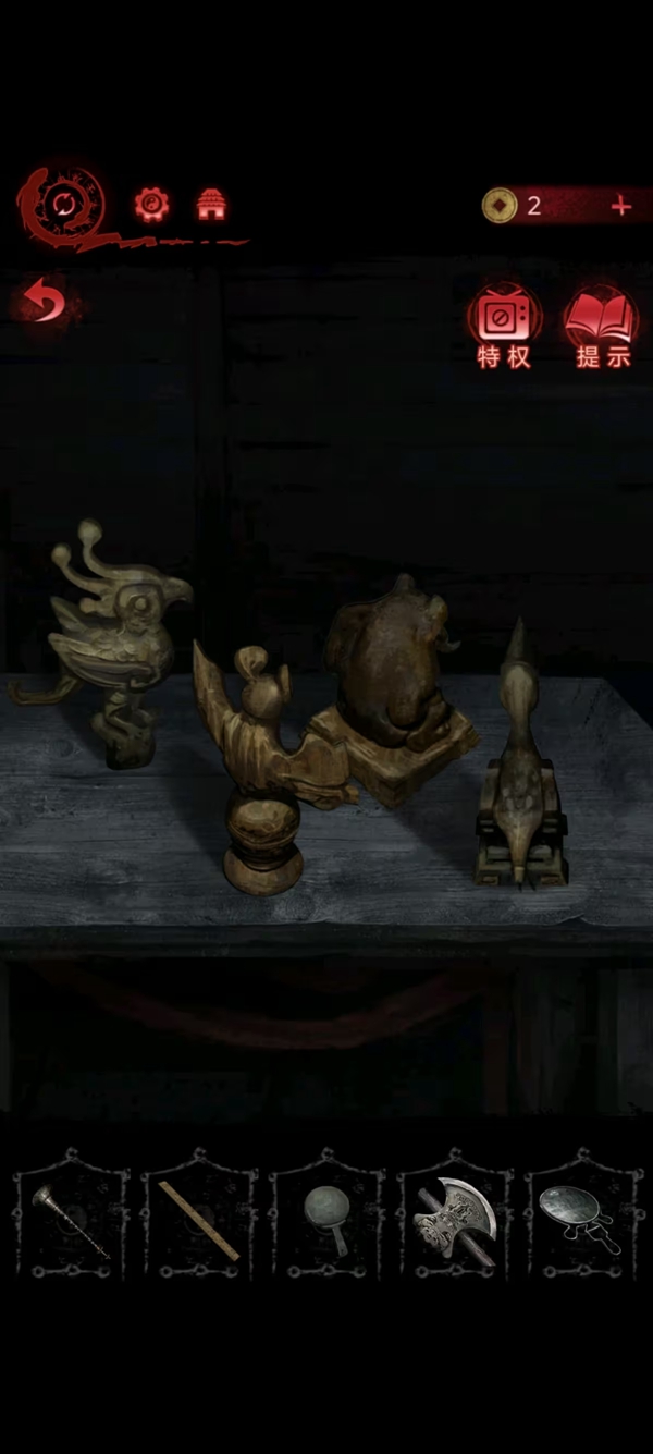9、男主铜镜给女主,女主视角解锁镜子和出口,用铜镜破除砍树幻象上船,获得蝙蝠木雕并放桌子上,查看线索后把船和古币放在右边的图上,按线索摆放,获得夸泽木雕和❤,把❤给男主,用夸泽“醍醐灌顶”石人获得线索。